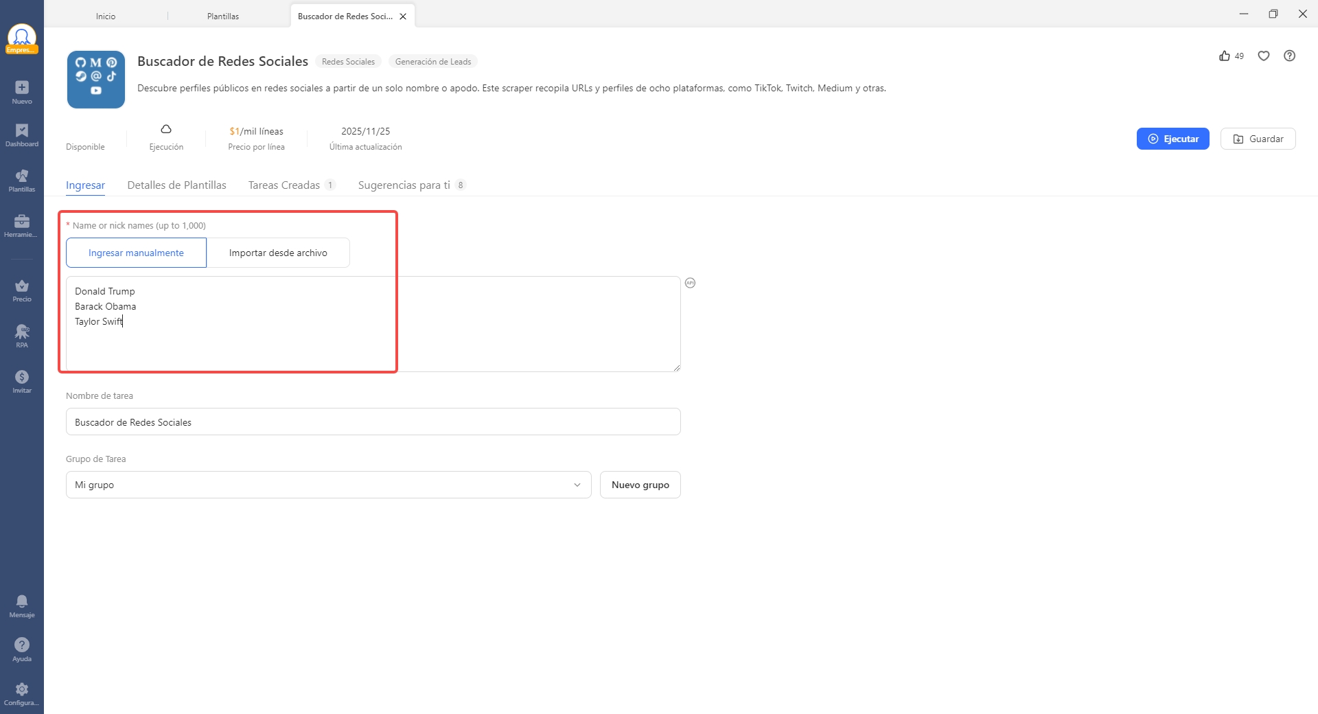 Con solo introducir nombres (cada entrada admite 1000 nombres.), la herramienta identifica perfiles públicos en múltiples plataformas —como TikTok, YouTube, GitHub, Medium, Twitch o Pinterest— y organiza todos los datos de forma estructurada para su análisis.