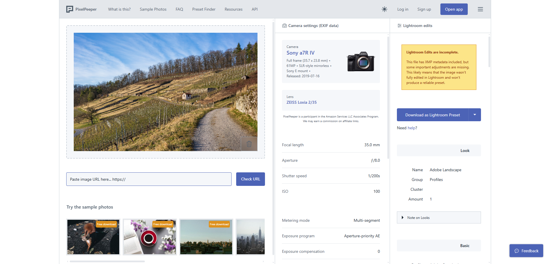 En el siguiente ejemplo, PixelPeeper permite acceder a la imagen original y mostrar sus parámetros técnicos cuando los metadatos están presentes.