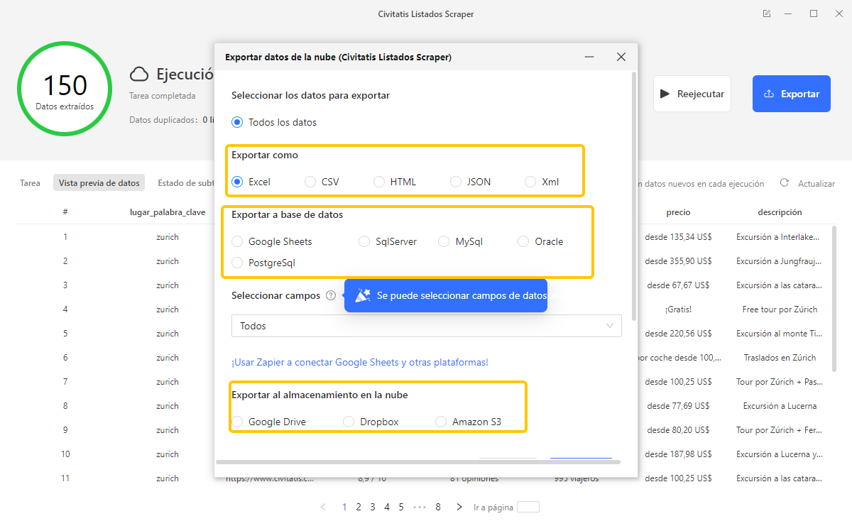 5. Exporta los datos como Excel/CSV o, si lo prefieres, en JSON/HTML/XML, y también puedes enviarlos a Google Sheets, bases de datos o almacenamiento en la nube (Google Drive, Dropbox, Amazon S3).