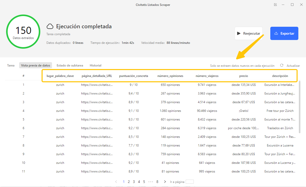 3. Haz clic en Ejecutar para iniciar la extracción y obtener toda la información detallada de cada actividad.
