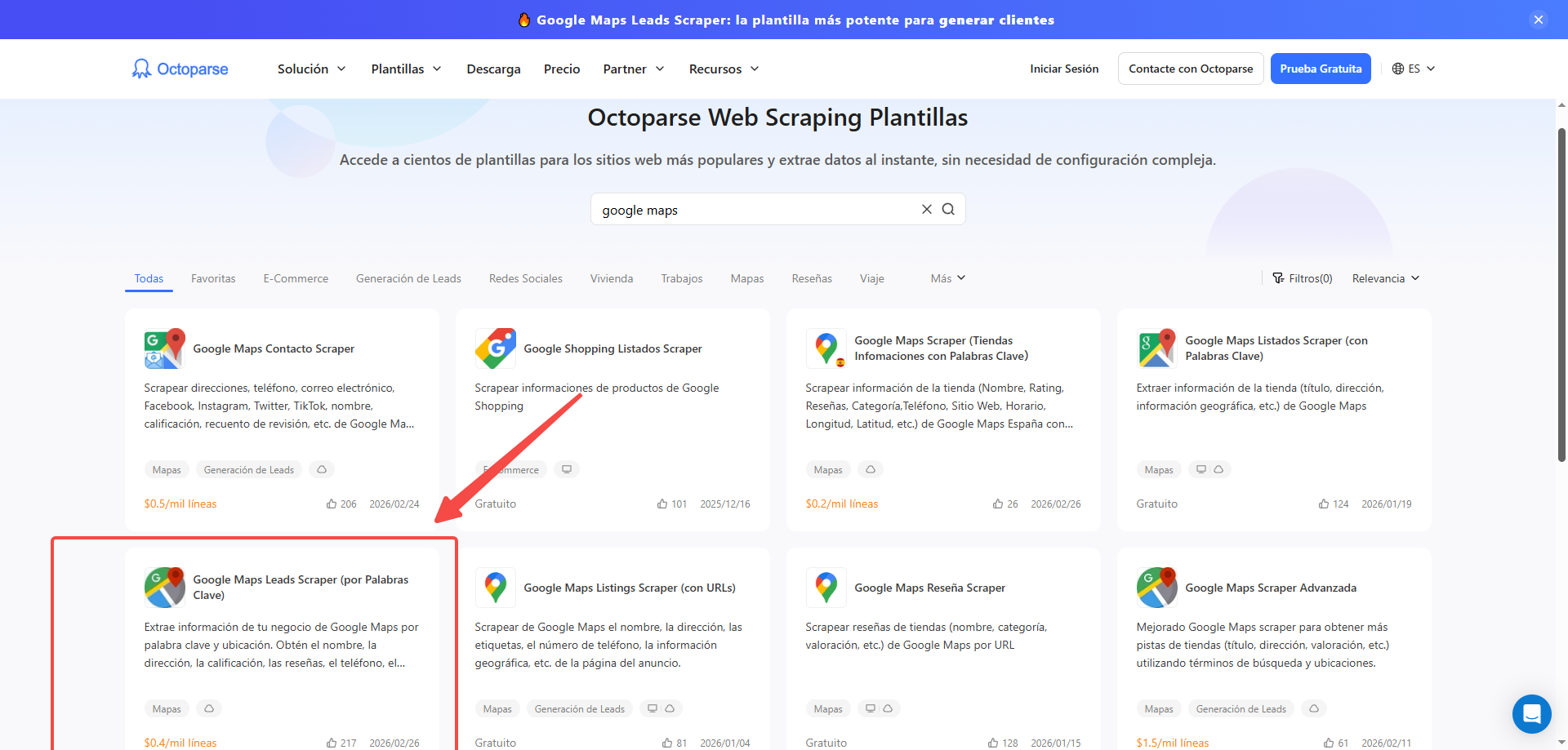 Abre Octoparse y busca la plantilla Google Maps Leads Scraper (por Palabras Clave). También puedes acceder directamente desde la galería de plantillas buscando “Google Maps”.