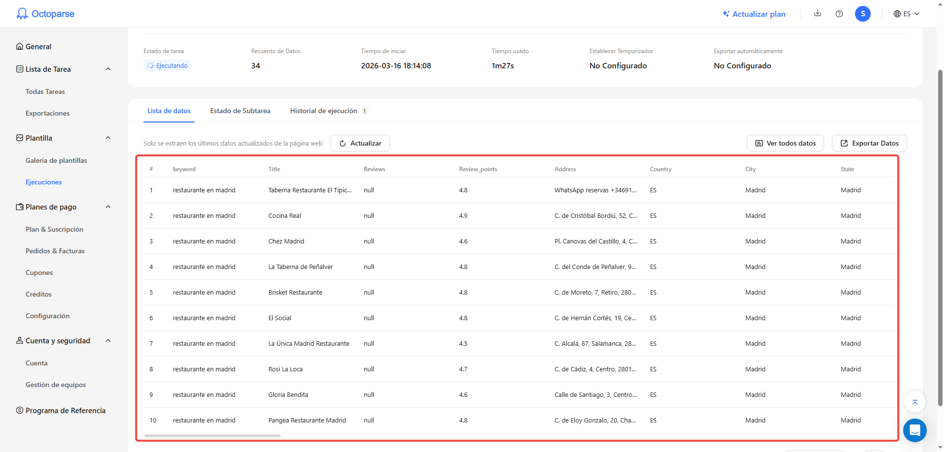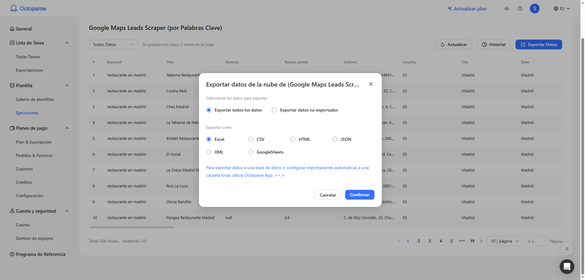 Octoparse tiene un plan gratuito que te permite hacer extracciones de prueba sin coste. Para volúmenes mayores o para programar extracciones periódicas necesitarás uno de los planes de pago. No existe ninguna opción oficial de Google para exportar listados de negocios en masa de forma gratuita: la API de Google Maps tiene límites de uso y costes asociados a partir de cierto volumen, por lo que una herramienta de extracción suele ser la opción más práctica y económica para obtener datos a escala.