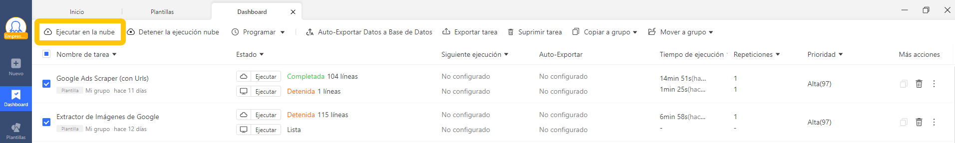 También puedes ejecutar múltiples tareas desde la nube simultáneamente: selecciona las tareas que quieras en la Lista de tareas y haz clic en Iniciar ejecución en la nube para lanzarlas todas juntas.